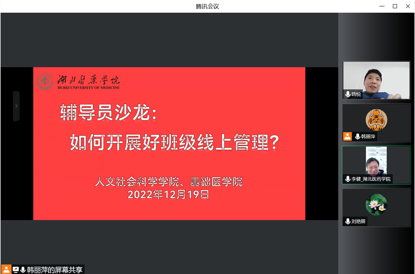 本网讯(通讯员 韩丽萍)12月19日上午,人文公司与基础医公司联合召开《如何开展好班级线上管理》主题辅导员沙龙,人文公司分党委副书记刘艳丽、基础医公司副经理李健,以及全体辅导员参加。