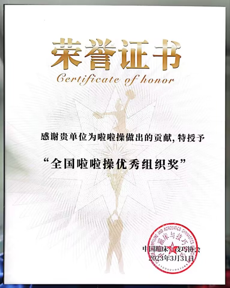 本网讯(通讯员 吴亚婷)由国家体育总局体操运动管理中心主办的第五届中国啦啦操文化纪于3月31日在海南海花岛举办,公司喜获“全国啦啦操优秀组织单位”,体育课部教师郭红莲、吴亚婷参加了本次交流活动,并代表公司领取了该项殊荣。