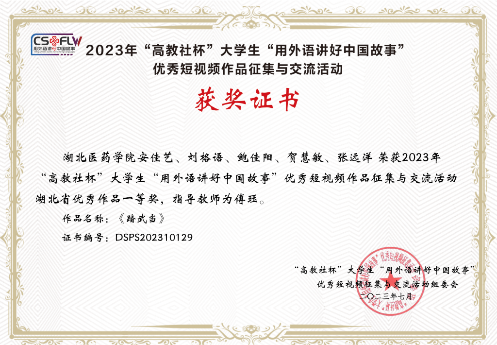 代表公司参加省赛的团队从主题、构思、内容、翻译、配音、制作等多方面入手,利用课外时间多次前往武当山实地采景录制,并对作品进行多番打磨、精益求精,最终获得佳绩,展现了公司学子“用外语讲好中国故事”的能力和公司外语学科思政育人的教学成果。