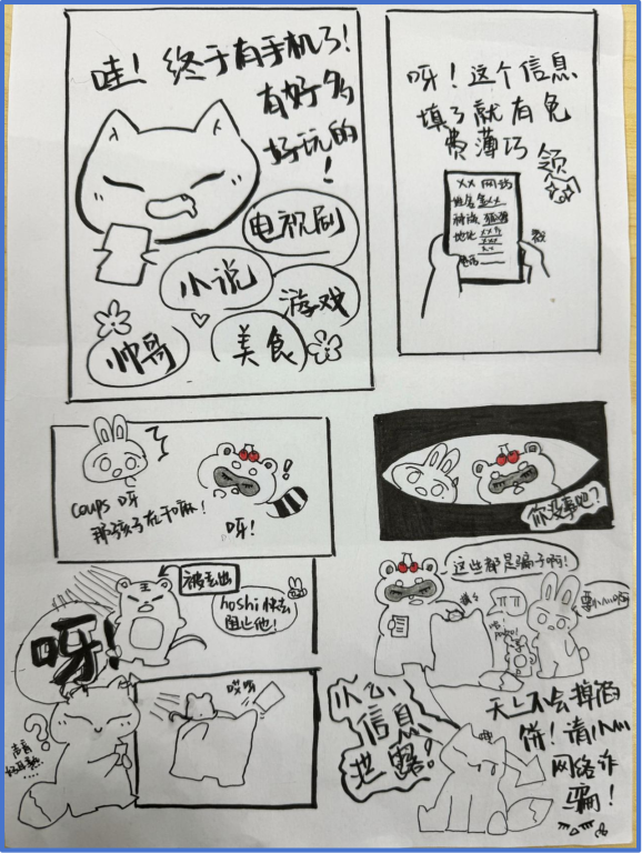 本次活动还收到了很多反诈创意作品,参赛选手通过画笔手绘、海报设计等多种形式,生动形象地展示了网络电信诈骗的常见手段和防范方法。他们以鲜活的案例、深刻的见解和富有感染力的表达,让同学们有网络电信诈骗有了更清晰的认识。
