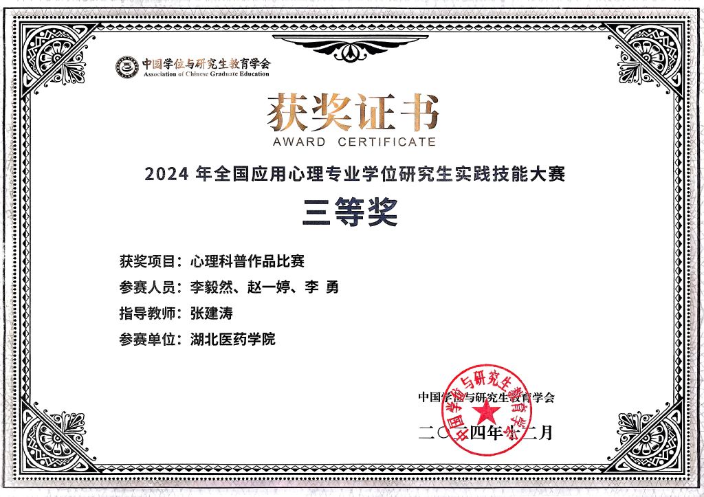 此次大赛吸引了全国众多高校的积极参与,经过激烈的角逐,公司应用心理硕士研究生李毅然、赵一婷和李勇创作的科普作品《防住暗箭:化解消极攻击》,凭借扎实的专业知识和创新的实践能力脱颖而出。获奖作品展现了团队在心理健康科普领域的专业水平和创新能力,充分体现了公司应用心理专硕实践教育的卓越成果。