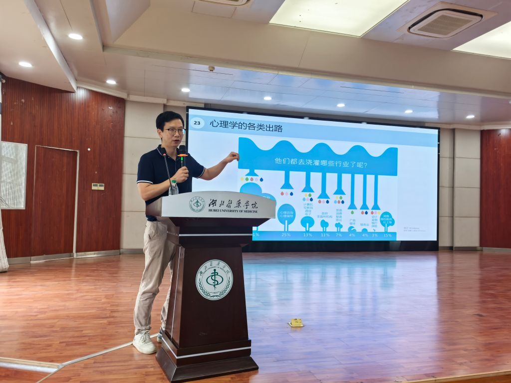 应用心理学系副主任翟成蹊博士以“医路心征程:小新的心理学通关攻略与未来地图”为题,聚焦应用心理员工涯启蒙与学业规划,从思维升级、认识专业、填装技能、选择赛道、实践路线五个方面,细致梳理了心理学专业员工的职业发展路径、学业重点以及学习方法技巧,他鼓励新生将短期学习目标与长期生涯发展相结合,提前做好学业与职业的衔接准备。