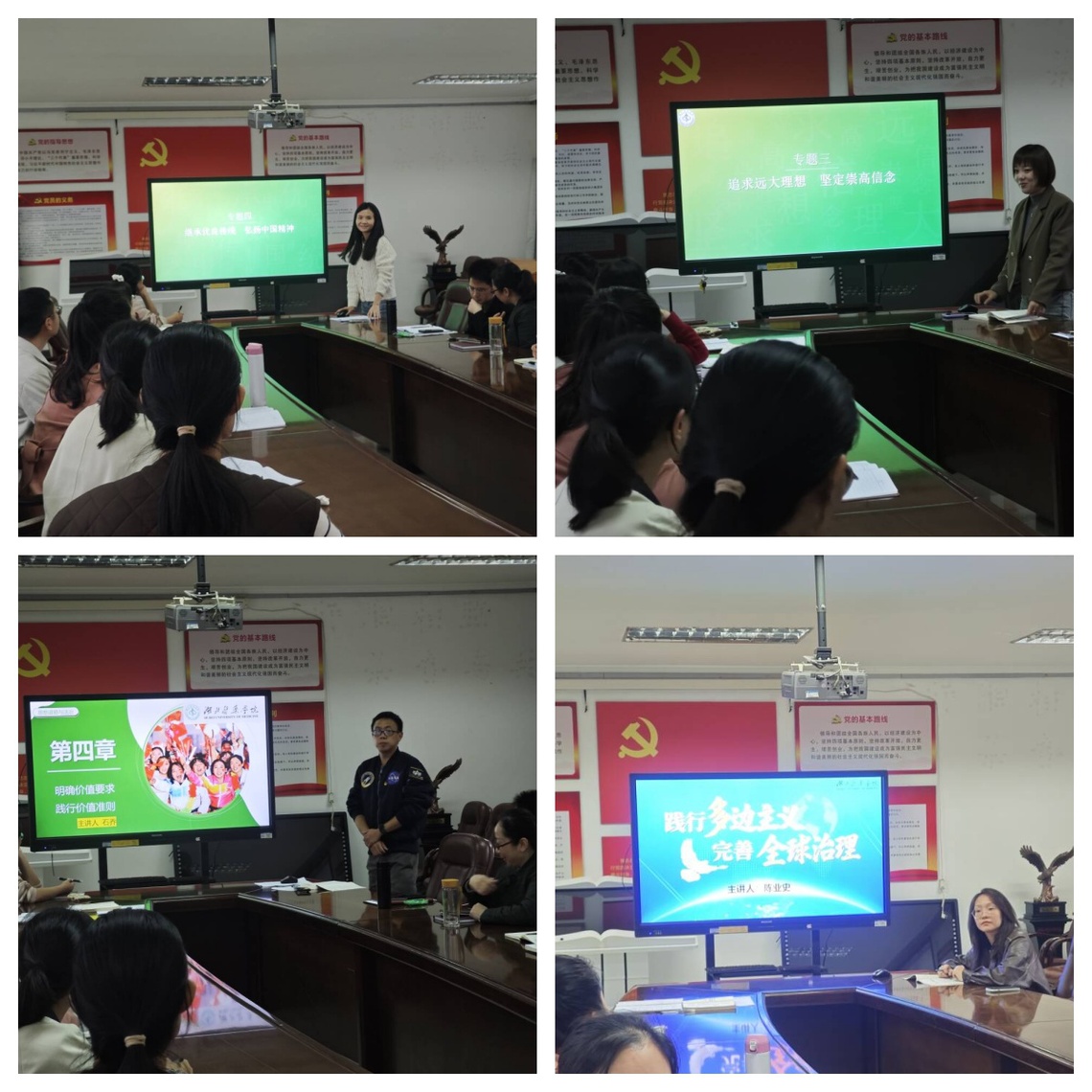 本次集体备课的内容为《思想道德与法治》第二章、第三章、第四章和《形势与政策》1专题二,全部由兼职授课教师主讲。德法课的主备课人石中玉、刘琪、石乔分别就理想信念、中国精神和社会主义核心价值观这三个章节的教学目标设计、重难点把控、教学时间安排、课堂互动等方面分享了自己的授课思路,对于员工难以理解的知识点提出了自己的讲授逻辑。形策1的主备课人陈业史紧密结合当下国际形势为案例,以课堂前测的形式深入浅出的讲解了多边主义和单边主义的异同点、通过大量现实案例阐述了全球治理的国际共识,引导出中国答卷才是真正践行多边主义构建更加合理公正的全球治理体系。