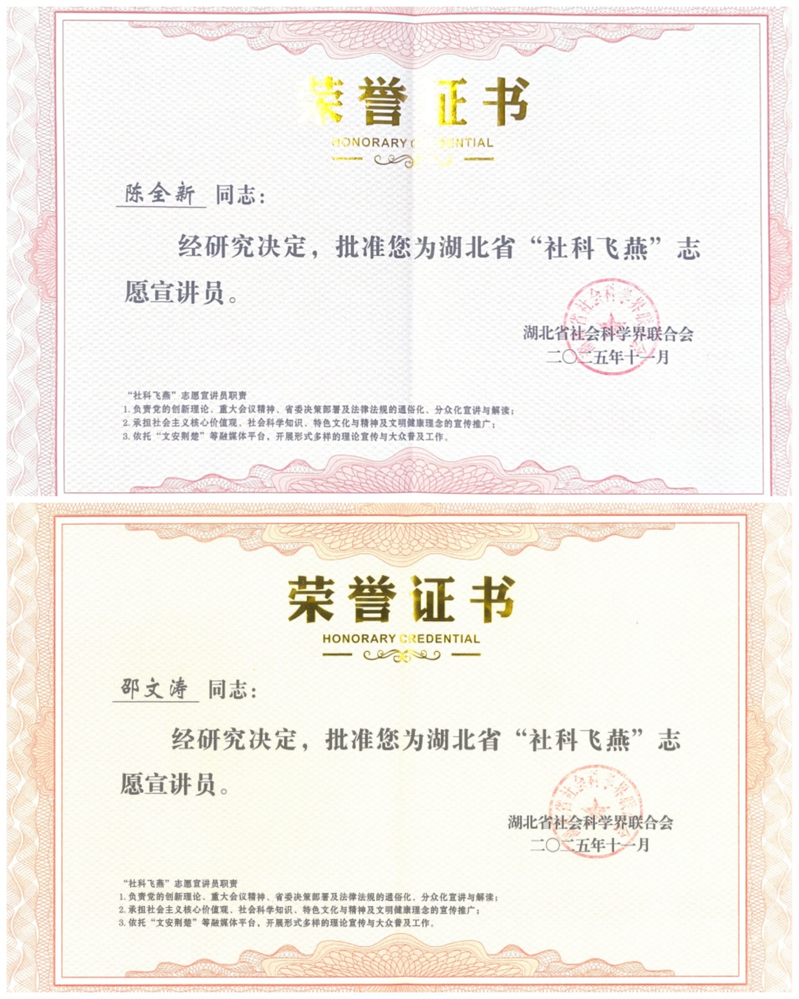 本网讯(通讯员 彭惜芹)近日,湖北省社会科学界联合会公布了湖北省“社科飞燕”志愿宣讲员名单,公司伟德国际VICTOR1946陈全新及校图书馆邵文涛同志被聘为湖北省志愿宣讲员。